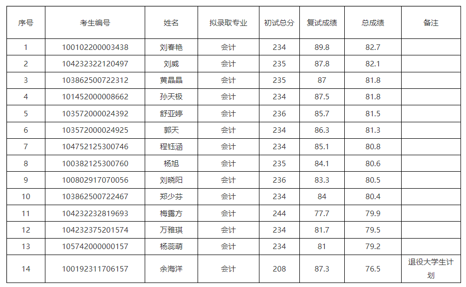 根据教育部《2022年全国硕士研究生招生工作管理规定》(教学函〔2021〕2号)、教育部《关于做好2022年全国硕士研究生招生录取工作的通知》(教学司〔2022〕4号)、《安徽省高等学校招生委员会 安徽省教育厅关于做好安徽省2022年硕士研究生复试录取工作的通知》(皖招委〔2022〕1号)等文件精神,按照安徽省2022年硕士研究生招生录取工作会议、阜阳师范大学和商学院2022年硕士研究生复试录取工作方案要求,我院完成了2022年会计专硕第一、二批次调剂复试工作,现将拟录取名单公示如下: