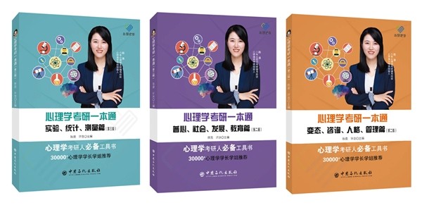 《一本通》系列又分为三本,第一本是紫色封面的普心、社会、发展、教育篇,第二本是蓝绿色封面的实验、统计、测量篇,第三本是橙色封面的变态、咨询、人格、管理篇。以上这11个科目基本覆盖了心理学学硕、专硕考研的所有内容,也正因如此,它的适用性很广,基本上覆盖心理学312统考和347专硕的考点内容。