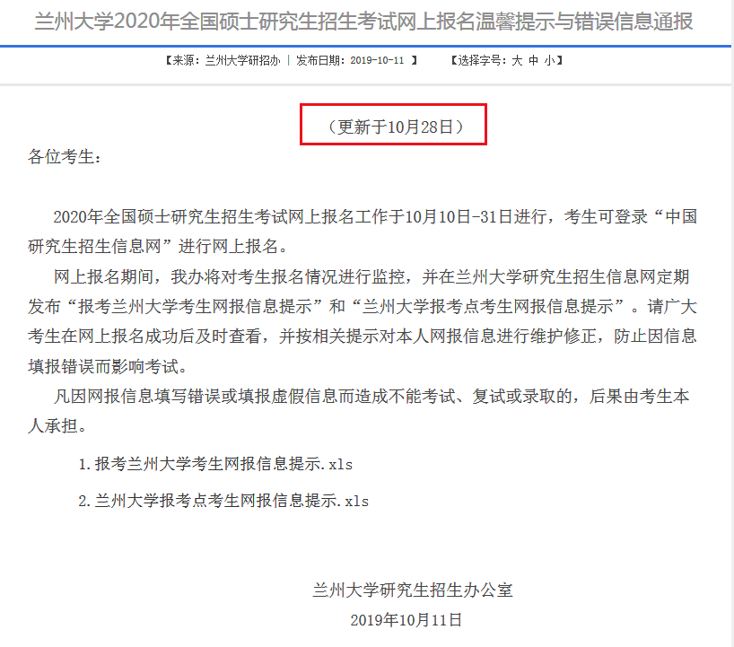 兰州大学2020年全国硕士研究生招生考试网上报名温馨提示与错误信息通报(截至10月28日)
