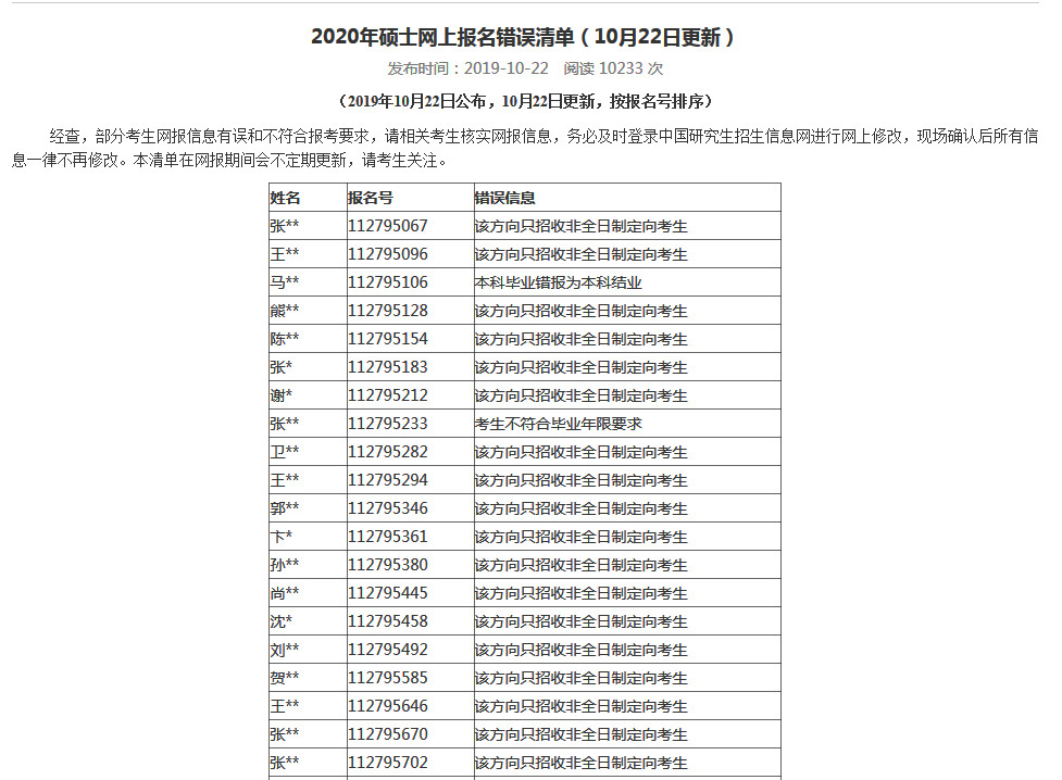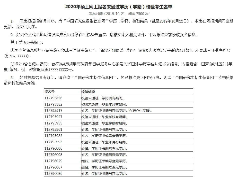 2020年硕士网上报名未通过学历(学籍)校验考生名单(截至10月22日)
