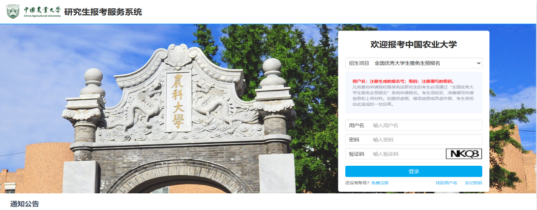 系统使用说明如下:1、考生登录网址 yzk.cau.edu.cn. 2、招生项目选择:全国优秀大学生推免生预报名。界面如下图: