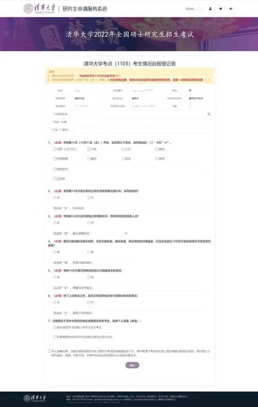 五、清华大学考点的所有考生(9位报名号为1103的考生)应从12月13日(含13日)起,进入清华大学研究生申请服务系统登录(首次访问时需要使用“中国研究生招生信息网” 报名时的二代居民身份证和邮箱地址进行注册):https://yzbm.tsinghua.edu.cn/ndLogin,进行考生情况自报。自报主要内容包括目前所在地、健康状况和是否涉疫等相关信息。特别注意:自13日填报起,后续如所在地、身体状况或其他信息发生变更时,须第一时间重新填报。