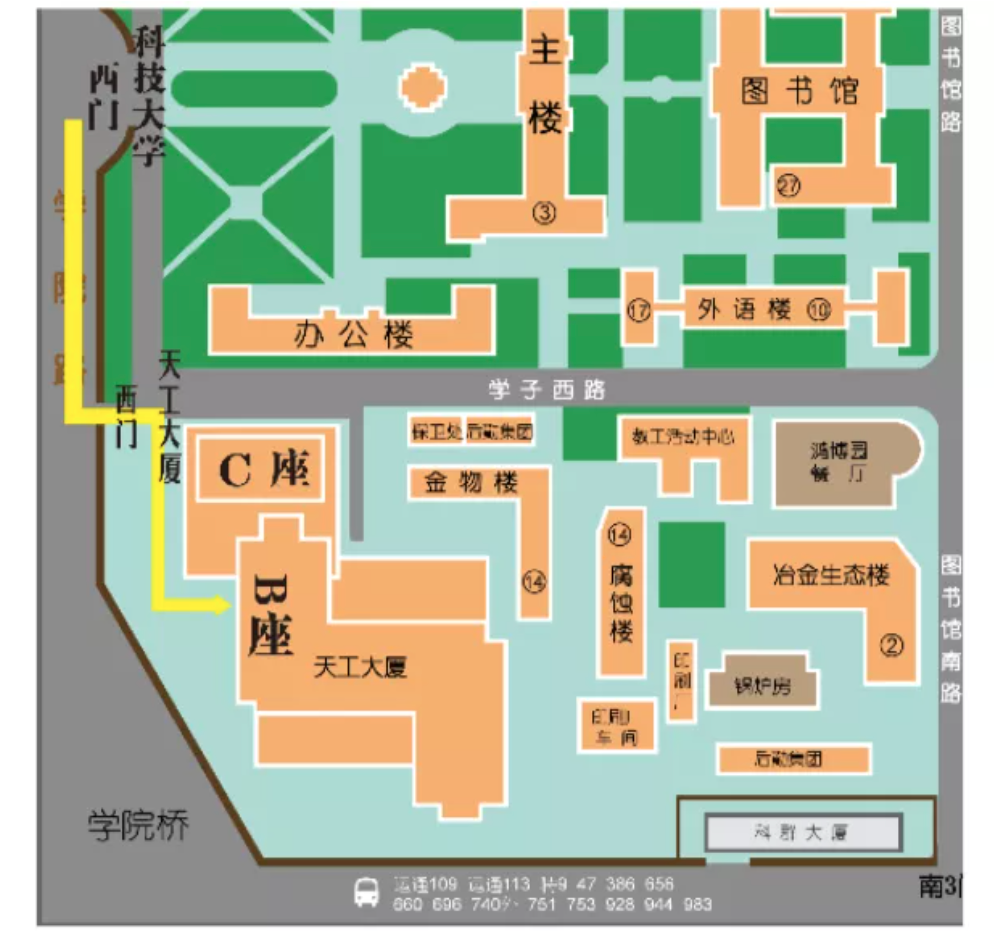 学校地址:北京市海淀区学院路30号。考场设在逸夫教学楼、教学楼、机电信息楼(考场分布见附件2),校外考生只能从学校西门(北四环学院桥向北)验证入校,沿规划好的路线进入考场(见附件3);校内考生(含本校应届生、二学位考生、本校在职考生)均从科技楼门前验证处进入考场。因校园防疫管控要求,考试结束后,考生均应沿来时路线离开考场,校外考生自西门出离开校园,不得在校园内逗留。校内考生凭北京科技大学“电子通行证”动态通行码从科技楼南侧检测点通道离开。