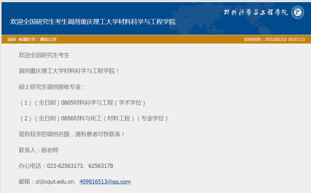 欢迎全国研究生考生调剂重庆理工大学材料科学与工程学院!