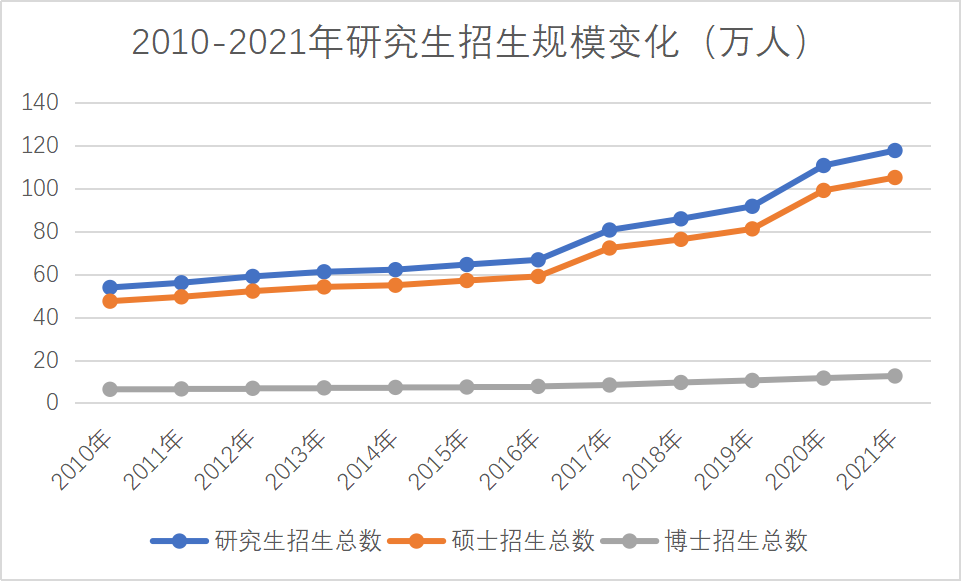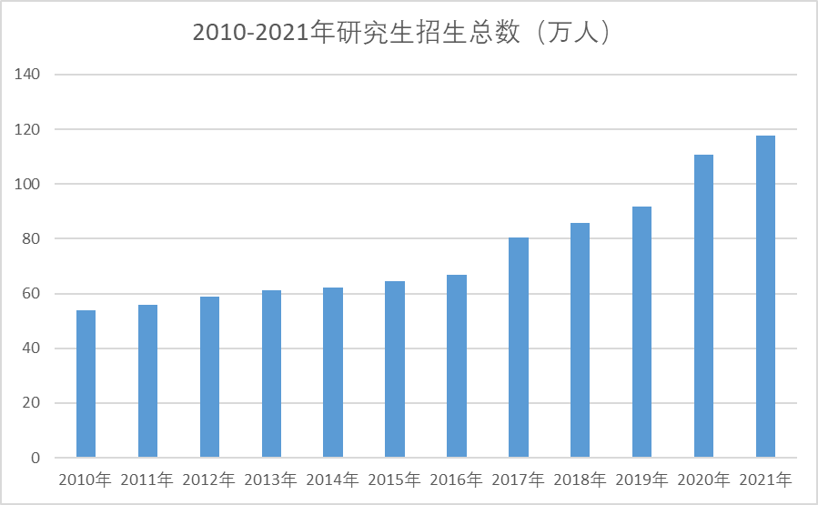 伴随高等教育的普及化,近年来,我国研究生招生规模持续扩大。2011年研究生招生总人数56万, 2021年则达到了近117.65万。十年间,研究生招生总人数增长近一倍。尤其是2020年招生中,为应对疫情带来的冲击,缓解就业压力,当年研究生招生增长20.7%,创下近年增长新高。