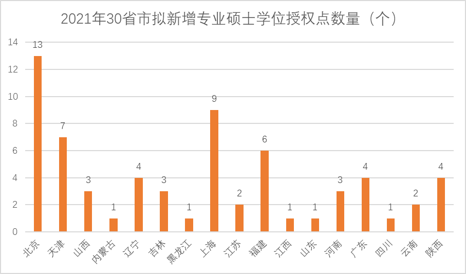 综合学位授权自主审核单位及动态调整增列学位授权点数据,2021年全国新增学位授权点(分省)中,北京市增列专业硕士学位授权点数量最多,增列学位授权点13个;其次是上海市,增列学位授权点9个。