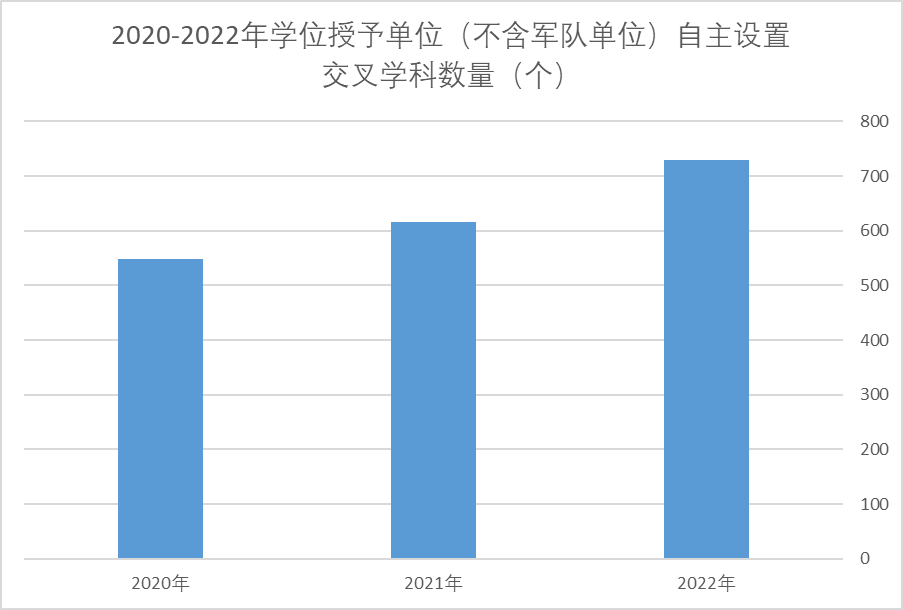 此外,自主设置交叉学科数量也在不断增长。2022年我国学位授予单位(不含军队单位)自主设置交叉学科数量为729个,同比增长18%。