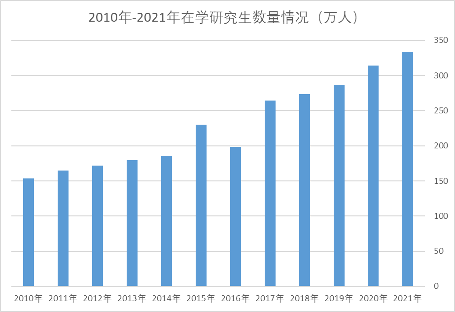 根据最新数据,2021年全国共有在学研究生333.2万人,对比2010的153.8万,增加了179.4万人,增幅超过一倍多。