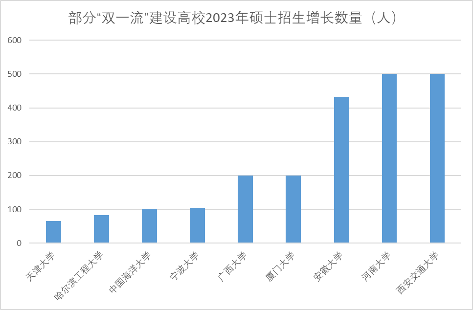 总体来看,多数高校硕士研究生招生规模不断扩大,部分学校增长幅度较大。与2022年全国硕士研究生招生计划相比,2023年“双一流”高校招生计划均明显增长。其中,西安交通大学2023年计划招收硕士研究生7500人,相比2022年增加招生计划500人。