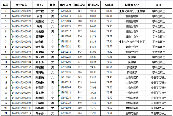 根据参加2020年全国硕士研究生统一入学考试考生初试、复试成绩,经我院教育委员会审核通过,2020年我院拟录取29名统考硕士研究生,名单如下: