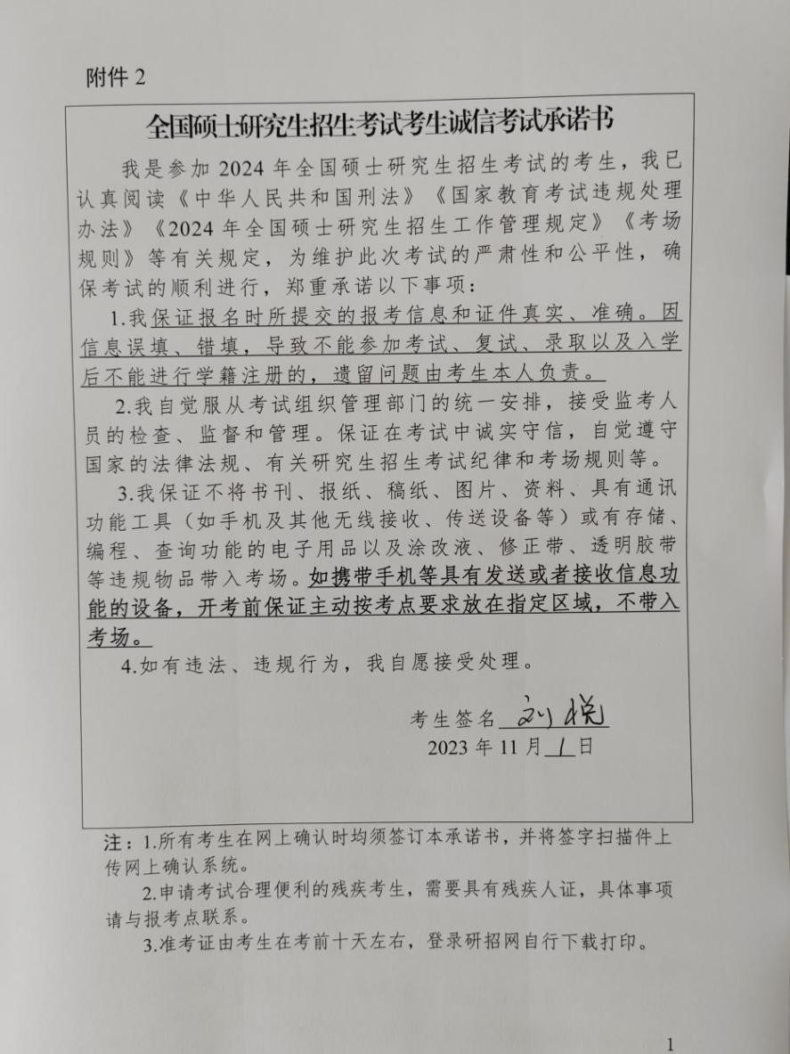 (诚信考试承诺书照片示例)