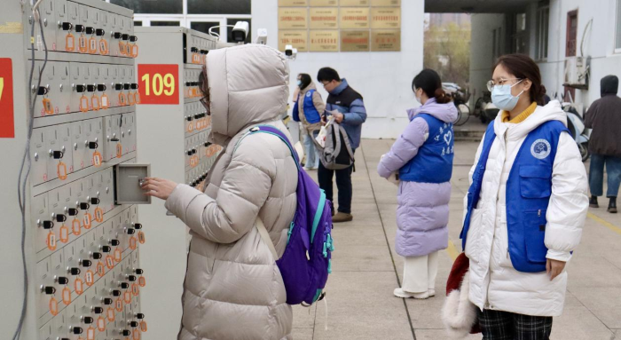 二、安检服务:科技赋能,严守公平底线。在连云港市教育考试院的关心和大力支持下,今年考点全面升级智能安检系统,严格采用“双检”模式——考生需依次通过智能安检门初检和考场入口金属探测仪人工复检,严防违规物品带入考场。这一举措不仅提高了入场效率,更通过技术手段杜绝了作弊隐患。同时,考点设置了2个手机集中保管区,配备了17个手机保管柜并安排20余名研究生志愿者专人看管,确保考生和工作人员的电子设备安全存放,避免其因误带通讯工具引发的违规风险。