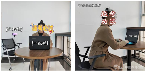 双机位操作:考生双手摆放桌面,第一机位从正面拍摄,放置在距离本人30cm处,完整拍摄到考生双手以上身体部位。第二机位从考生侧后方45°距离本人1m处拍摄,可以拍摄到考生侧面及主设备电脑全屏幕,需保证面试考官能够从第二机位清晰看到第一机位屏幕。如下图所示: