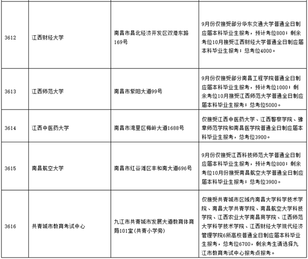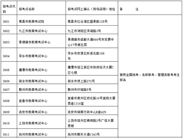 (2)部分高校报考点考生:江西师范大学、部分南昌工程学院普通全日制应届本科毕业生可选择江西师范大学报考点;江西财经大学、部分华东交通大学普通全日制应届本科毕业生可选择江西财经大学报考点;南昌航空大学、部分江西科技师范大学普通全日制应届本科毕业生可选择南昌航空大学报考点;江西中医药大学、江西警察学院、豫章师范学院和南昌医学院普通全日制应届本科毕业生可选择江西中医药大学报考点。上述10所高校剩余考生也可以选择南昌市教育考试院报考点报考。