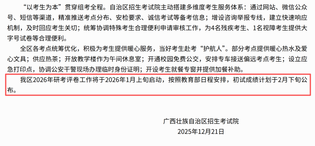 2.广西壮族自治区广西的26研考评卷工作将在2026年1月上旬正式启动。按照教育部的统一日程安排,初试成绩计划在2月下旬公布,后续可以多关注广西教育考试院的官方通知。