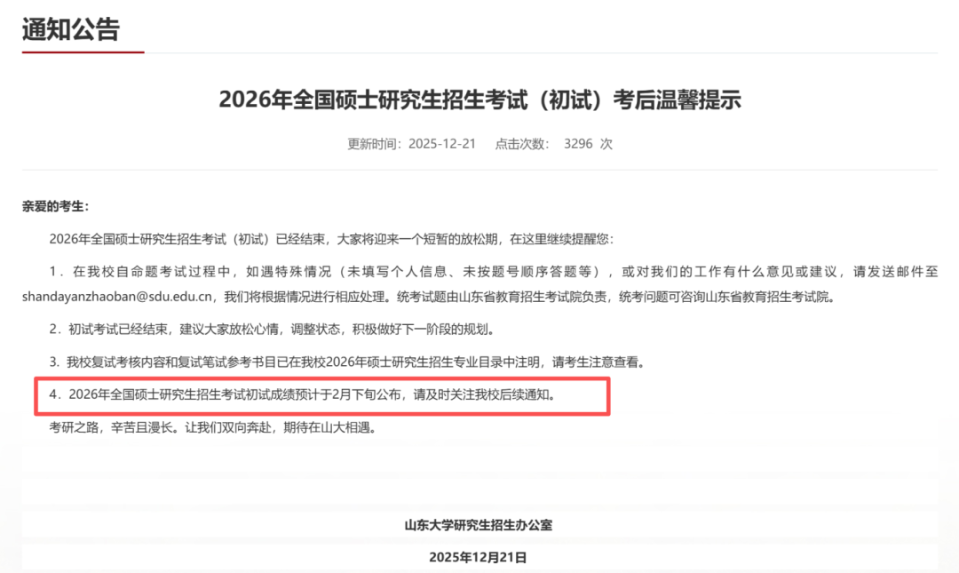 3.山东大学山东大学明确,26考研初试成绩预计在2月下旬公布,大家要及时留意学校研究生招生办的后续通知。另外有个重要提醒:如果在自命题答题时遇到特殊情况,比如没填个人信息、没按题号顺序答题等,或者对学校招生工作有意见建议,都可以发邮件反馈,学校会根据情况处理。如果是统考相关问题,就需要咨询山东省教育招生考试院。