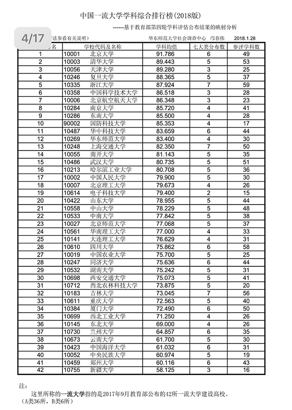 28日傍晚,华东师范大学社会调查中心发布“中国大学学科综合排行榜”。基于教育部第四轮学科评估公布结果,采取映射方法研究分析后,最终形成的2018版中国大学学科综合排行榜,位于前五名的分别是: 北京大学、清华大学、天津大学、复旦大学和浙江大学。