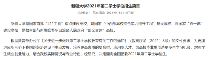 新疆大学发布第二学士学位招生简章,根据学校实际情况与招生总规划,确定2021年招收第二学士学位生共计200名,学制2年。