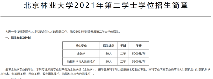 北京林业大学第二学士学位只招收北京林业大学全日制普通高等教育2021年应届本科毕业生。且只招收金融和数据科学与大数据技术两个专业。