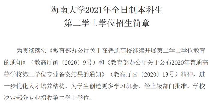 海南大学2021年全日制本科生第二学士学位2个招生专业计划总数为90人,每个专业招生计划45人,招生专业有园艺和动物医学。