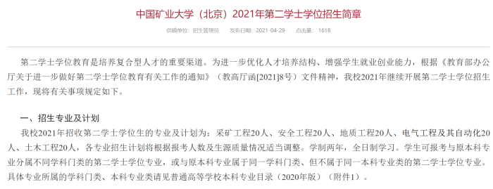 中国矿业大学(北京)2021年招收第二学士学位生的专业及计划为:采矿工程20人、安全工程20人、地质工程20人、电气工程及其自动化20人、土木工程20人,各专业招生计划将根据报考人数及生源质量情况适当调整。
