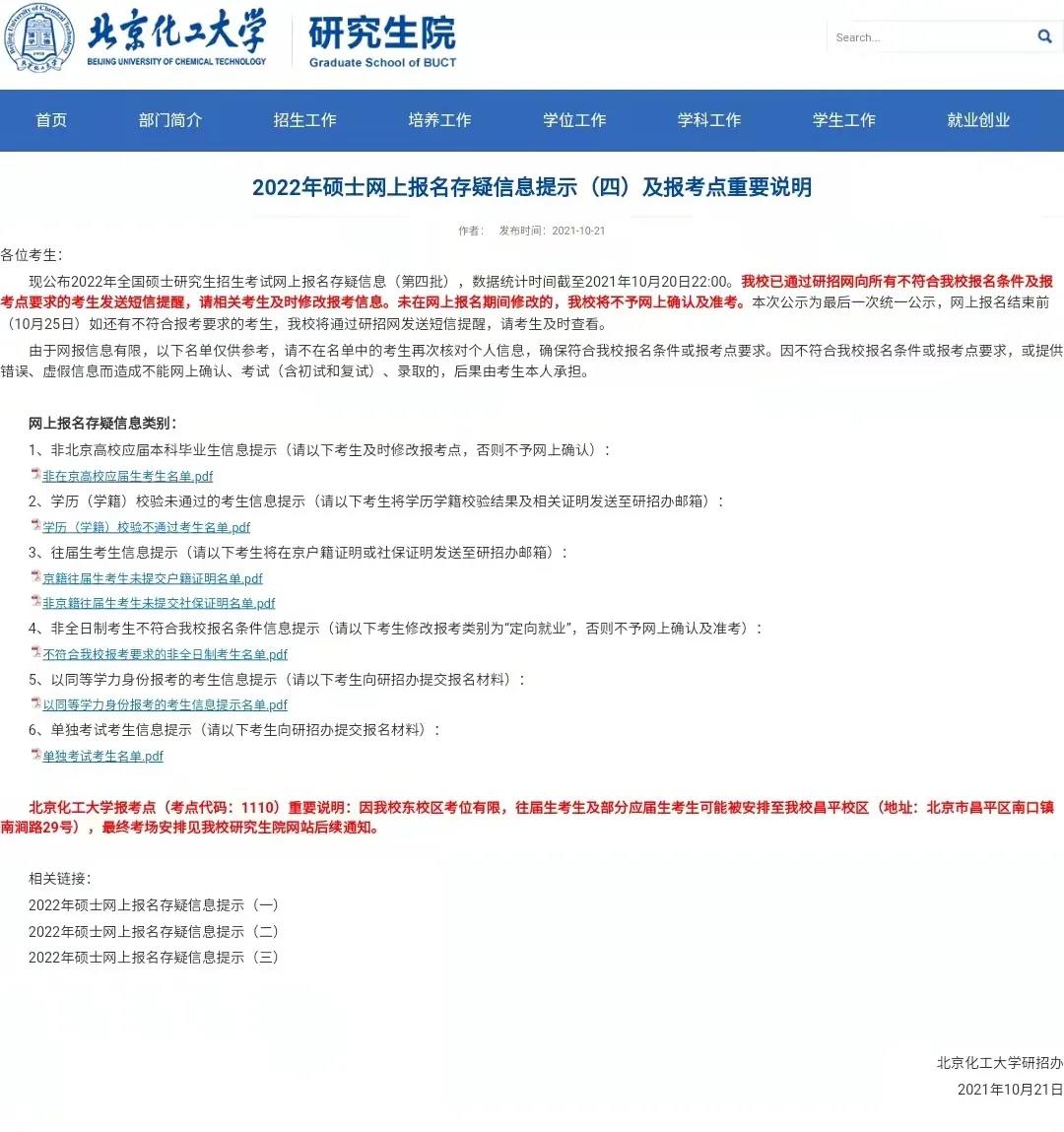 2022年全国硕士研究生招生考试报名已近尾声。为帮助考生顺利报考,中国人民大学、中国政法大学、北京化工大学等报考点和招生单位近日发布了考生提示公告,提醒不符合报考点报考要求的考生要及时更改信息,以免耽误考试。