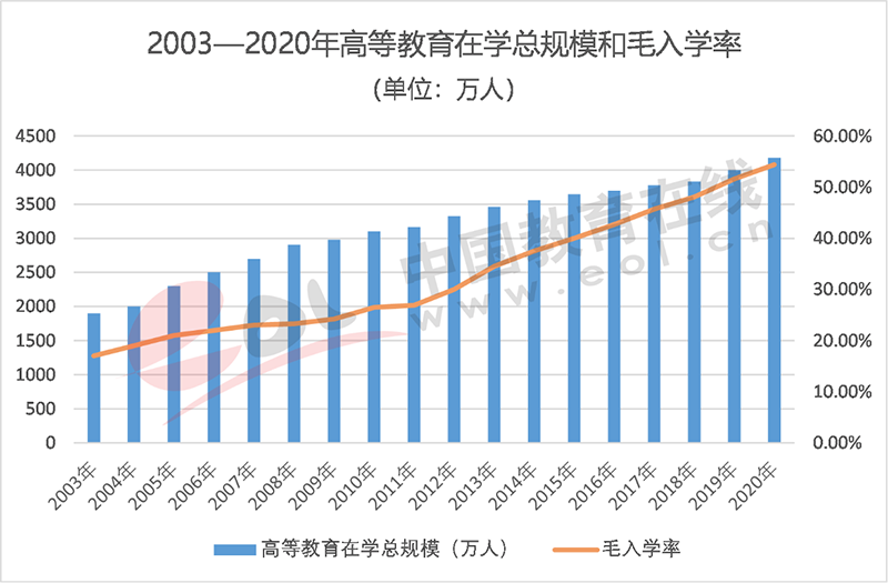 1999年大扩招,开启了高等教育普及化之路。2019年,高等教育毛入学率超过50%,去年则上升至57.7%,每年增长3个百分点,高等教育普及化来得非常迅猛。有人说,不就一半人上大学吗?事实显然比我们想象的夸张。