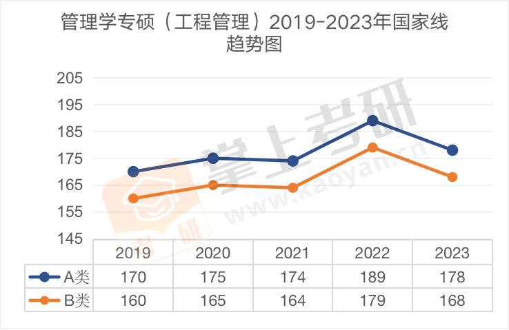 考研分数线|管理学专硕(工程管理)2019-2023年国家线趋势图(专业学位)
