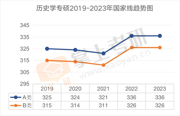 考研分数线|历史学专硕2019-2023年国家线趋势图(专业学位)
