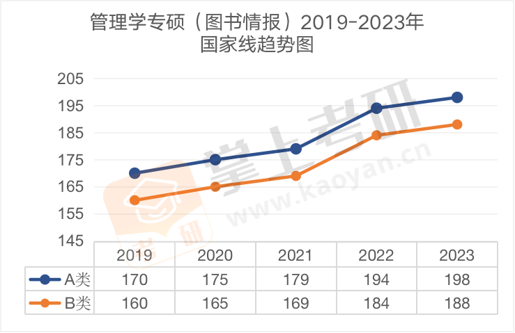 专业学位:管理学专硕(图书情报)2019年-2023年国家线趋势图