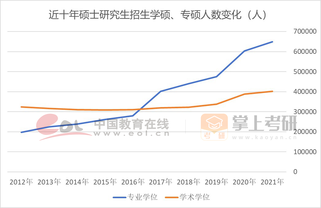 在研究生招生总人数中,专硕招生人数增长明显。从2012年的19.7万增长到2021年的64.9万,专硕招生人数增长3倍多。