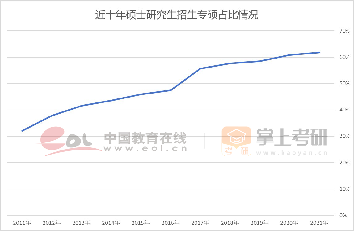 近十年硕士研究生招生中,专硕占比逐年提升,2021年占比将近62%,远超学硕。