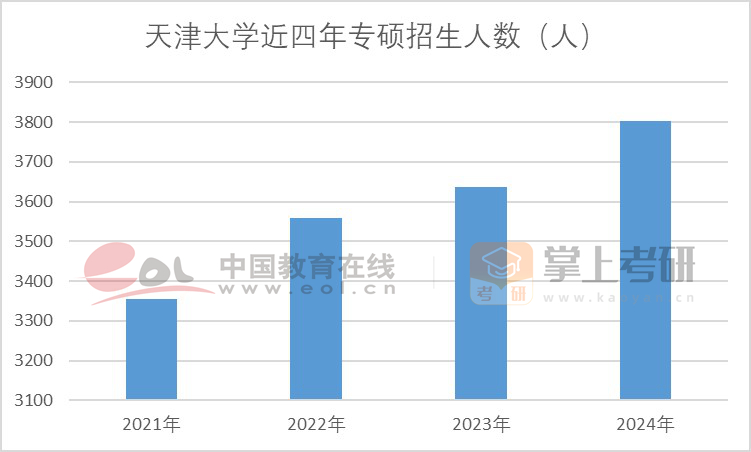 天津大学近四年来招收专业硕士人数逐年增加。从2021年招收专硕3355人,到2024年招收专硕3804人,四年间扩招专业硕士449人。