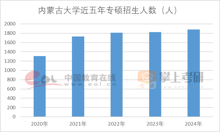 内蒙古大学2020年招收专硕1305人,到2024年招收专硕1882人,五年间扩招专硕577人。