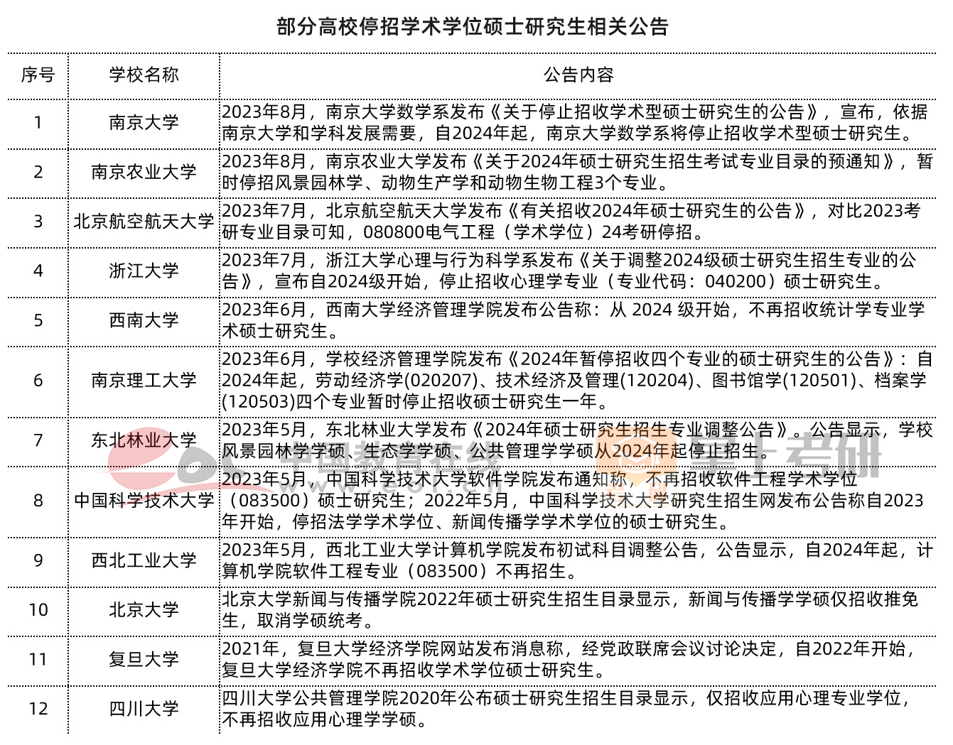 2023年6月,西南大学经济管理学院发布公告称:从 2024 级开始,不再招收统计学专业学术硕士研究生。此外,中国科学技术大学和西北工业大学也宣布,不再招收软件工程学术学位硕士研究生。东北林业大学的风景园林学、公共管理学两个学硕专业也从2024年起停止招生。