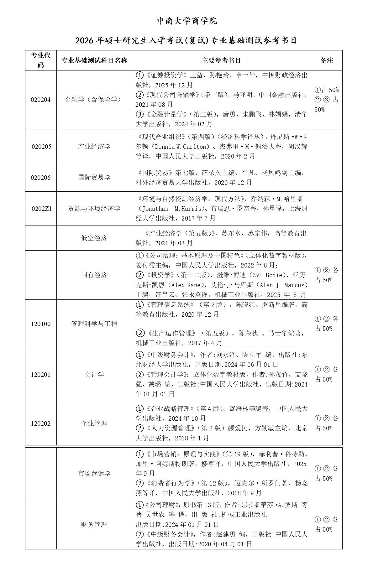 2026年1月20日,中南大学商学院公布2026年硕士研究生入学考试(复试)专业基础测试参考书目,为考生复试专业备考提供明确依据,助力针对性复习。具体参考书目详见下文。