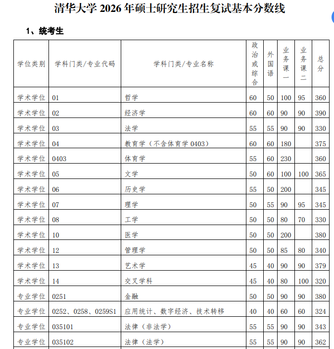 清华大学2026年硕士研究生招生复试基本分数线公布