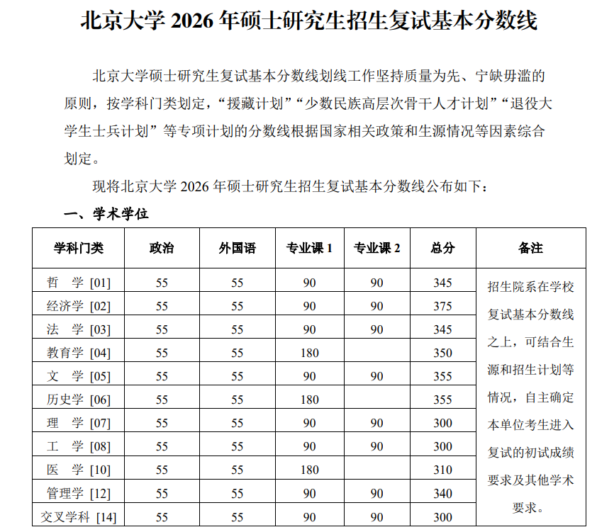 考生可通过点击链接下载查看:北京大学 2026 年硕士研究生招生复试基本分数线