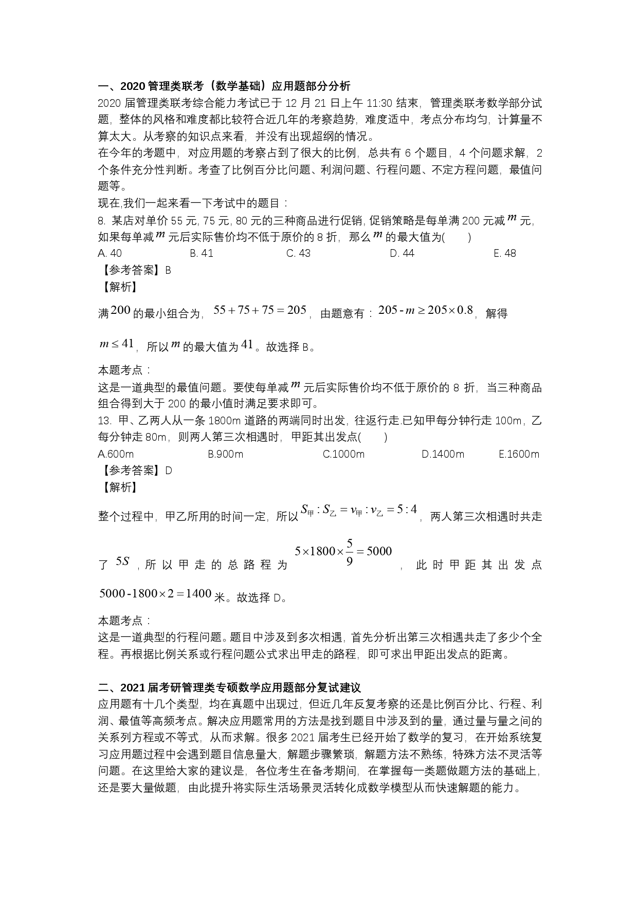 2020年管理类联考数学试卷分析:应用题