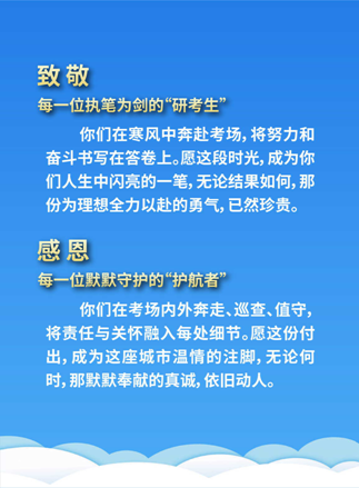 天津市2026年全国硕士研究生招生考试于12月21日温暖收官。从市委市政府的统筹谋划,到全市各部门的精细举措,所有组考参与者都怀着“把每一件小事做扎实”的责任感,齐心搭起了坚实可靠的“研考保障网”,稳稳托住了6.1万人装满期待的梦想,完成了“平安研考”的暖心约定。