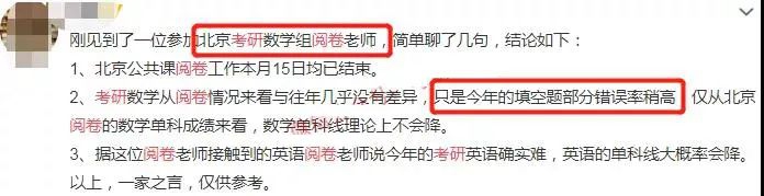 “北京公共课(数学)阅卷15号结束”、“阅卷与往年几乎没差异,今年的填空题部分错误率稍高”、“数学单科理论上不会降”,顺带也提到了“英语确实难,单科线大概率会降”。
