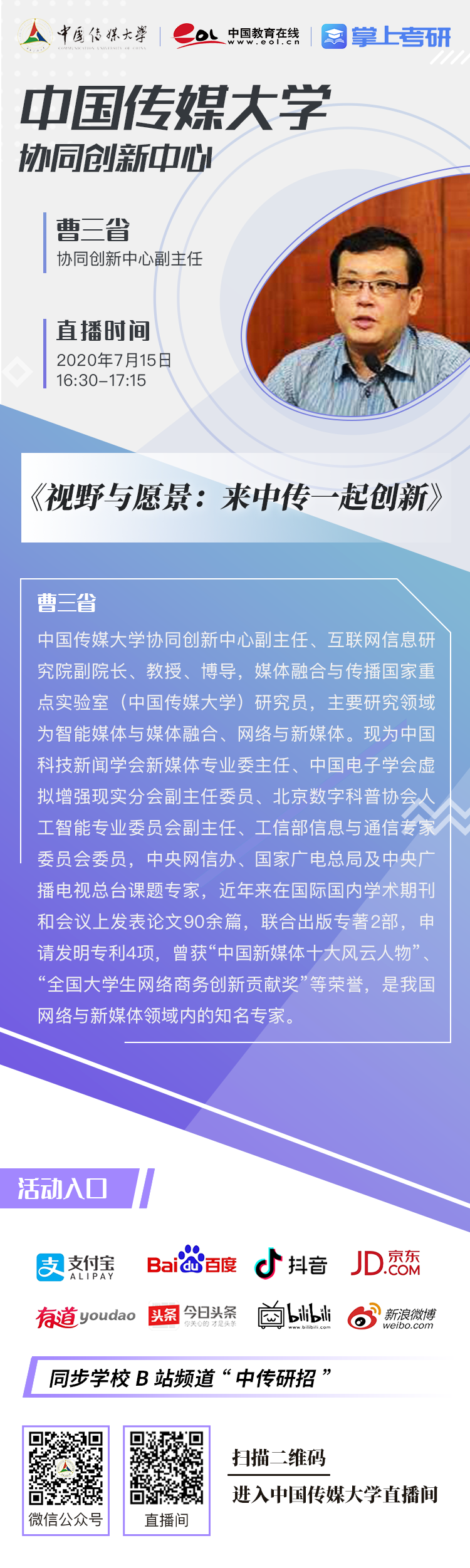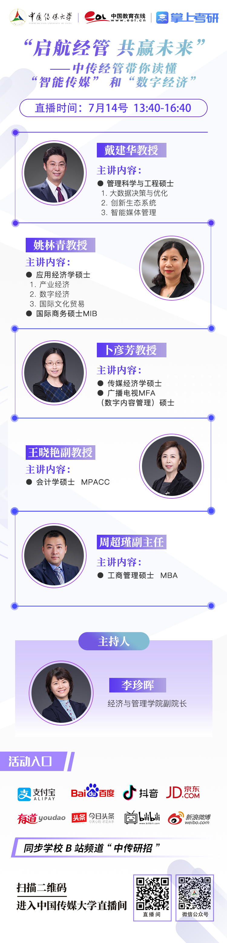 直播咨询会将在支付宝校园频道、新浪微博、百度教育频道、网易有道、京东校园app梨涡、哔哩哔哩(@掌上考研)、今日头条等多平台同步播出。
